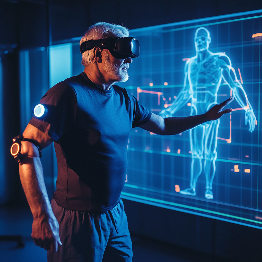 Un paciente realizando ejercicios de rehabilitación física en un entorno virtual interactivo. El paciente lleva puestos sensores en las articulaciones y está inmerso en un videojuego que simula actividades físicas. | Foto: IA, Dr. Marco Benavides. #Medmultilingua.
