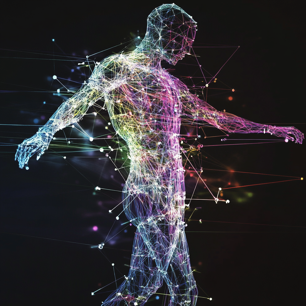 Visualización de un grafo geométrico aleatorio complejo, mostrando la interconexión entre puntos que representan las articulaciones de un cuerpo humano durante la rehabilitación. Los puntos están distribuidos en un espacio tridimensional y conectados por líneas que varían en grosor según la distancia. | Foto: IA, Dr. Marco Benavides. #Medmultilingua.